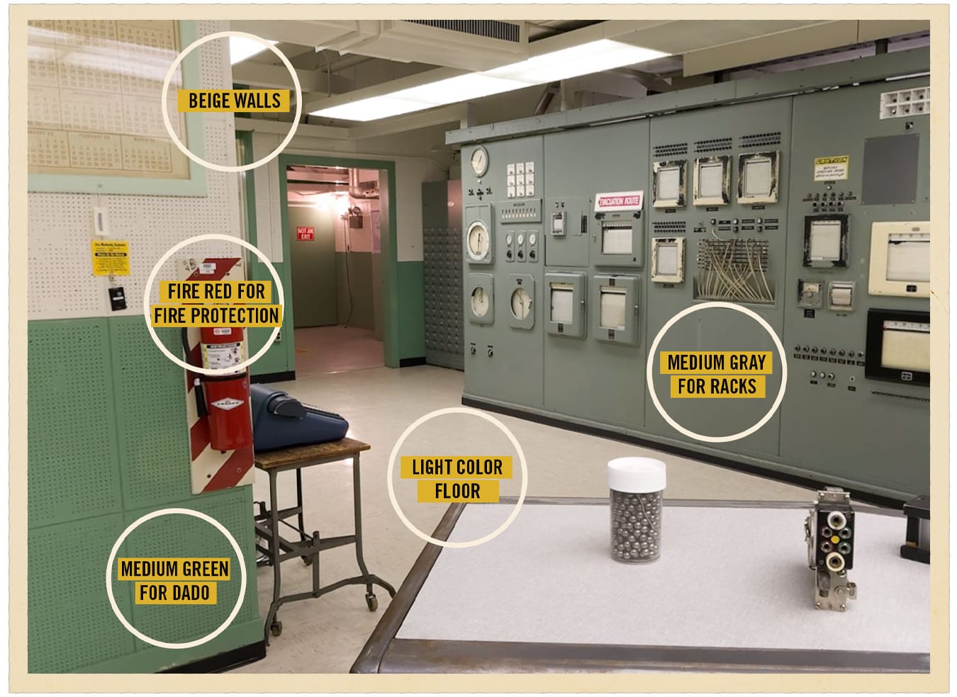 I happened upon this blog post by a designer named Beth Matthews about why so many mid-century industrial control rooms were seafoam green. I've long loved this aesthetic since my days working around beautiful cast machine tools painted varying shades of these tones. (In fact, it's the inspiration behind the entire Merriman Industries branding!) Matthews' research added some delightful new trivia: this palette was designed by an early color theorist named Faber Birren.